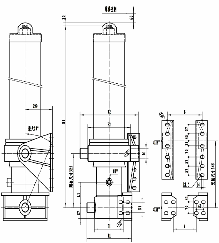 B1/W1 | 265/405 | 215 | D1有 60/ L1 有160/ H1為液壓缸封閉尺寸,對(duì)照上表具體型號(hào)。 所有安裝螺栓及自鎖螺母的規(guī)格為M16。 墊圈規(guī)格為φ17× 支座與液壓缸之間的最大間隙為 鎖緊支座螺栓后,焊接定位板。 |
